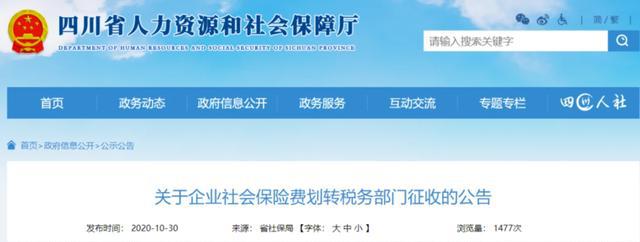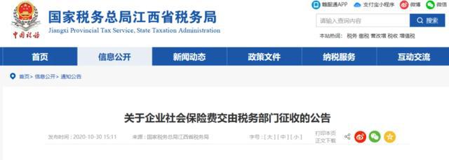 10月30日 北京、上海、山東、山西、湖南、四川、貴州、吉林、江西等地同時(shí)發(fā)布了《關(guān)于企業(yè)社會(huì)保險(xiǎn)費(fèi)交由稅務(wù)部門征收的公告》的通知。