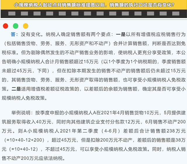 第一個問題:小規(guī)模納稅人起征點月銷售額標準提高以后,銷售額的執(zhí)行口徑是否有變化?