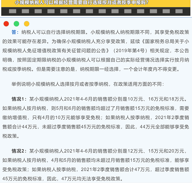 第二個問題:小規(guī)模納稅人可以根據(jù)經(jīng)營需要自行選擇按月或者按季申報嗎?