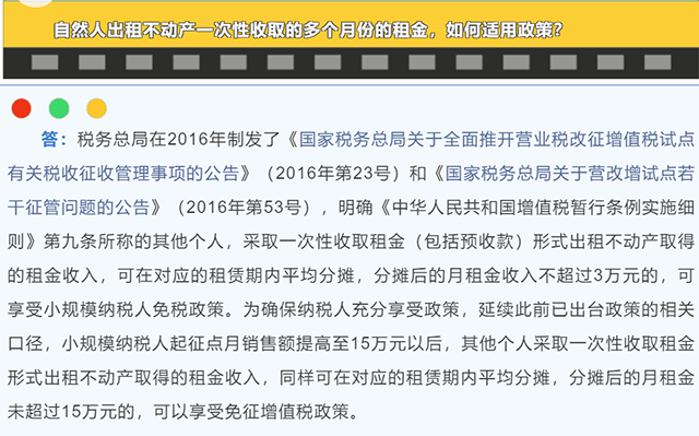 第三個問題:自然人出租不動產(chǎn)—次性收取的多個月份的租金,如何適用政策?