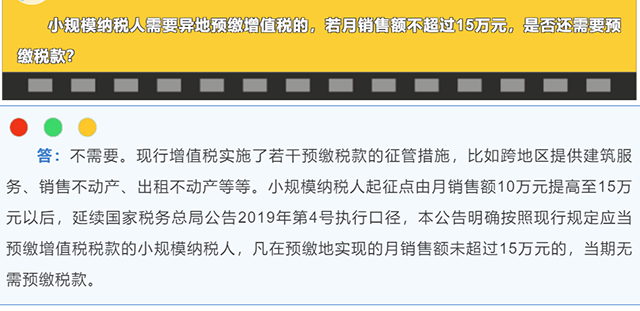 第四個問題:小規(guī)模納稅人需要異地預繳增值稅的。若月銷售額不超過15萬元。是否還需要預繳稅款?