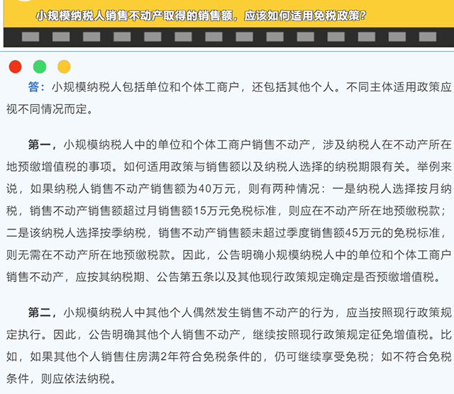 第五個問題:小規(guī)模納稅人銷售不動產(chǎn)取得的銷售額,應該如何適用兔稅政策?