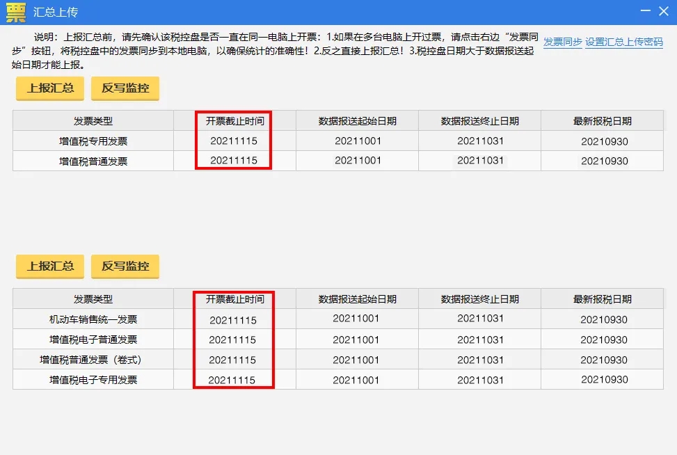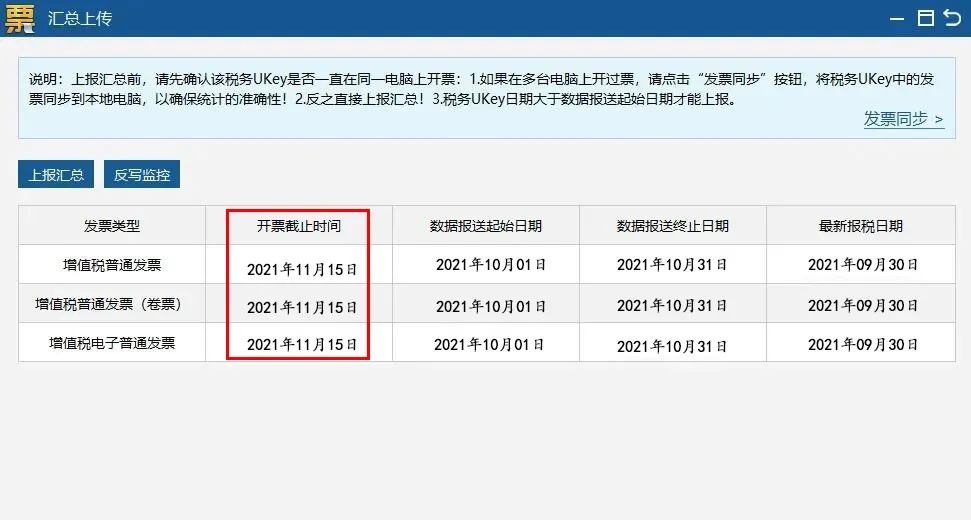 操作流程:重新打開匯總上傳界面,查看各發(fā)票類型開票截止時間是否更新到下月中旬,若更新,說明操作成功。