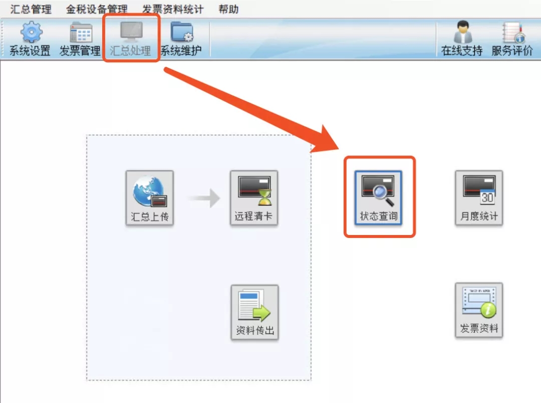 操作流程:點擊【匯總處理】-【狀態(tài)查詢】-【增值稅專用發(fā)票及增值稅普通發(fā)票】。